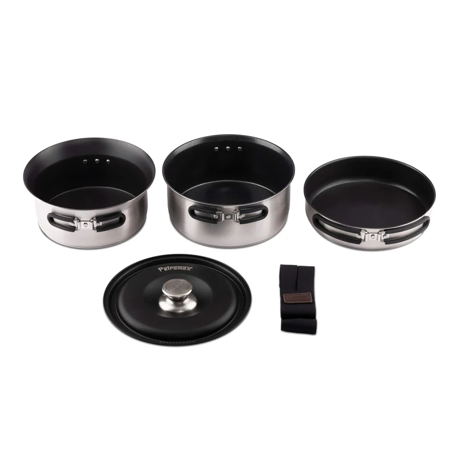 The Dimego camping pot set from Petromax is not only suitable for outdoor use, but also for use on induction stoves and all other types of stoves at home