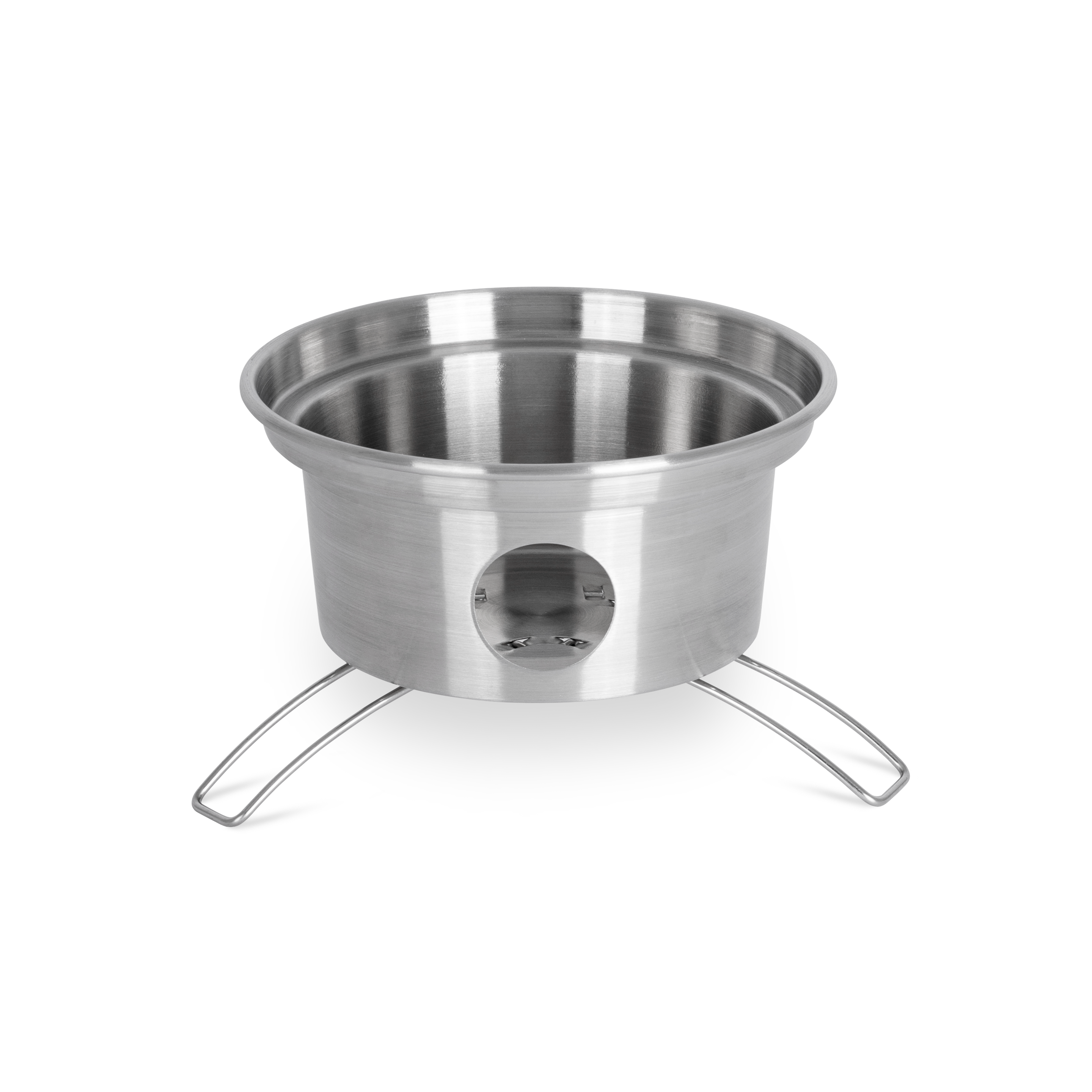 The chimney-style design allows you to build a small fire at its base, drawing air upward to create intense heat. This highly efficient combustion quickly transfers heat to the water held in the surrounding jacket, making it a self-sufficient outdoor stove. The included stainless cooking ring allows you to place small pots or pans on top, transforming it into a versatile cooking tool.