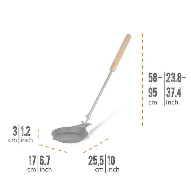 The Petromax campfire pan is your perfect helper for roasting directly in the fire. Thanks to the removable telescopic handle, you can keep a safe distance from the fire. Place the pan on a Petromax pan holder, stacking grid in the fire, or directly on the coals. Simply hang the campfire pan on the telescopic handle and use the wing screw to select the optimum distance from the fire. The wooden handle makes the pan easy to hold and as soon as the pan is on its bed of embers, you can remove the telescopic handle without having to come into contact with the fire.