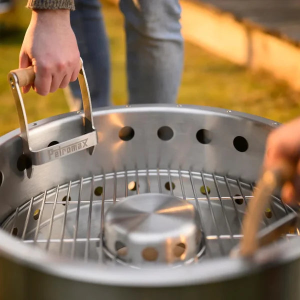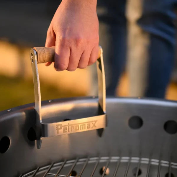 Robust stainless steel carrying handles with ergonomic wooden handle for effortless transportation of the Tyropit/Pyron. Can be attached without tools with a firm hold. The clever design minimizes contact with soot deposits and distributes the weight optimally.