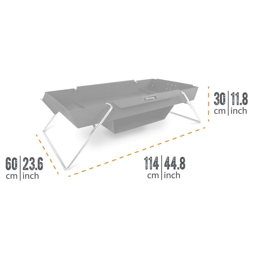 The indestructible fire bowl for great campfire adventures The Brennbock is your flexible and transportable outdoor fire bowl with which you can discover the diverse campfire cuisine everywhere. Thanks to a 50-liter capacity for firewood, charcoal, or barbecue briquettes, you'll easily gather a large troop around you to cook menus wherever your adventure takes you. Heated up: fire bowl with 50 l filling volume made of strong steel Flames are tamed in the steel fire bowl, as the high rim protects the fire and allows for a clean fireplace. Thanks to the jacking up by two easy to install stand brackets you can start your fire with enough distance to the ground. So you won't leave any traces when your outdoor cooking adventure begins with the heat-resistant and indestructible fire bowl. \n \nThe combination of fresh air and experience makes you hungry: treat yourself to something hearty by combining the fire bridge with the fire stand or erect the tripod over the steel fire bowl to grill steaks with unmistakable grill stripes on the suspended grate. You will benefit from the load-bearing capacity of the fire trestle, which can support up to 100 kg of cooking equipment. The flexible fireplace with baking compartment and detachable feet The fire rack helps you to serve several dishes at the same time, because the associated baking compartment allows you to gratinate a potato casserole, let juicy steaks cook or keep your farmhouse breakfast warm. In the baking compartment, the fire pans fp15 - fp30 or the grill fire pan gp35-t and the loaf pans k4 to k12 (without lid) find the perfect place until the hearty dishes are consumed by the fire. When you assemble the fire stand for the first time, you equip it with the baking compartment and then you can transport it in the car or van to wherever you want to start your outdoor adventure. The sturdy legs can be easily dismantled without tools, so that you can store them in the tray to save space after cleaning the fire stand from ash residues. Fits fire bridge FRK1 (sold separately)
