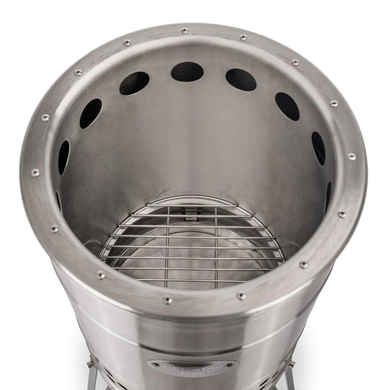 Why the Pyron Fire Barrel with smokeless effect is the ideal outdoor fireplace: • double-wall stainless-steel body with ventilation openings all round • effective and virtually smoke-free combustion thanks to sophisticated air-flow system • integral charcoal grate and removable ash dish for optimal positioning of fuel and easy cleaning • stable and protects the ground from heat thanks to high support legs • multifunctional with the addition of the Pyron Plate to create a plancha grill The Feuerhand Pyron enables you to relax around the fire so you can fully commit to enjoying cosy evenings with your guests. Made of high-quality stainless steel, this reliable fire barrel meets modern requirements and blends in harmoniously with the design of your terrace. The double-wall body is equipped with specially positioned ventilation openings, which are the reason why the Pyron Fire Barrel emits particularly low levels of smoke and soot on those mild summer evenings and cool autumn days. The Pyron Fire Barrel is the ideal fireplace for roasting marshmallows or bread at a comfortable height. Even in colder temperatures the Pyron keeps you pleasantly warm without producing a lot of irritating smoke. The material is exceptionally durable and will develop a distinctive patina over time. \n \nPrepare to be mesmerised by the flickering flames and add the Pyron Plate for a plancha-style grilling experience and unforgettable moments with your loved ones.